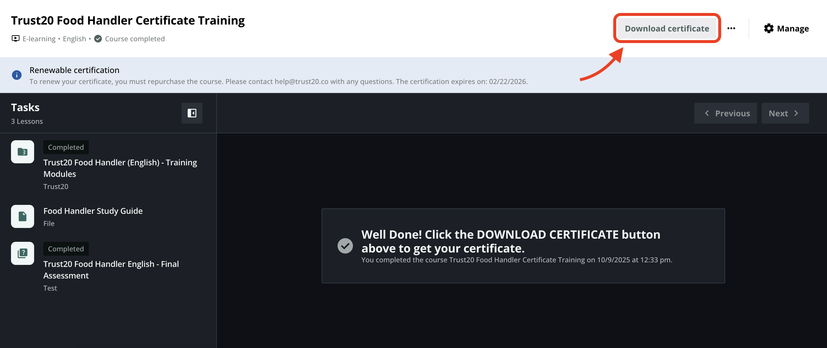 All learners are emailed upon completion of their course and passing the final assessment with a link to download their certificate. The certificate will also be available to download through the training portal.