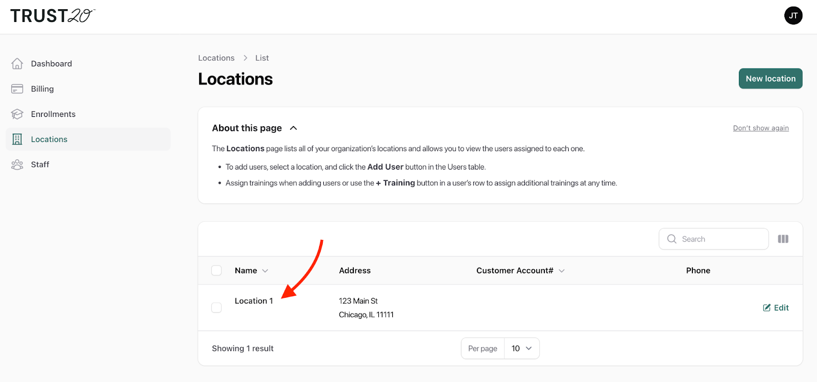 You can invite your staff to enroll and join your team on Trust20 by clicking the “Locations” tab on the left-hand side of your dashboard and then click which location you’d like to add your staff to.