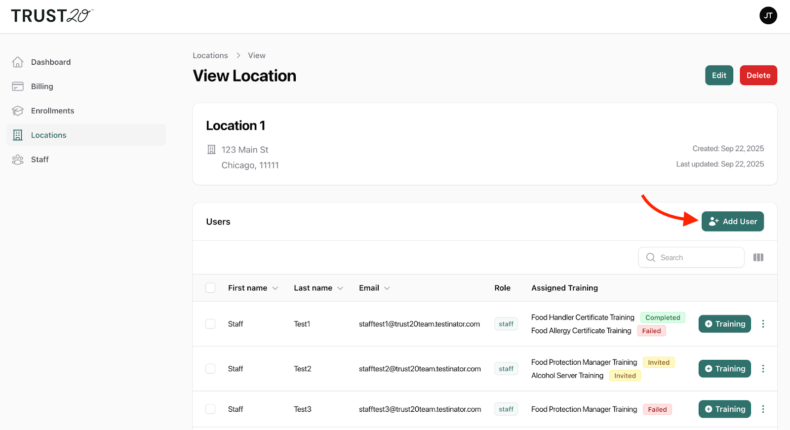 Fill in your staff member’s email address, first and last name, and role (staff or location manager). Select which training(s) you’d like to enroll them to, then click “Submit.”